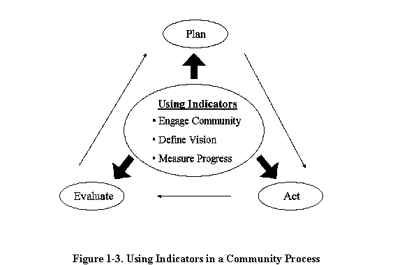 It is important to realize that, by themselves, indicators do not solve problems or make a community and its forest resources sustainable. Becoming more sustainable requires an ongoing process in which the community develops a plan, acts on the plan and then evaluates the results as shown in Figure 1-1.